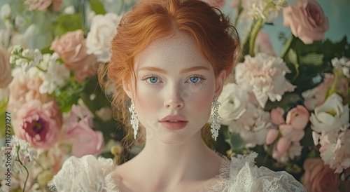 Naklejka premium an elegant woman with red hair and blue eyes in front of a bouquet of flowers. She is wearing white lace earrings and a vintage wedding dress