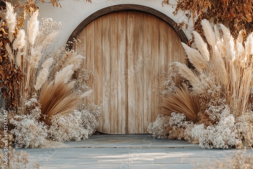 © Rena, Obraz premium An elegant wooden door decorated with natural dried floral arrangements