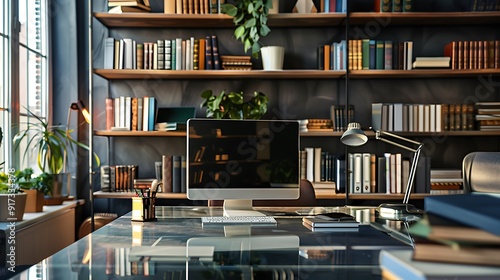 © Ansar, Fototapeta premium An elegant workspace with a glass desk, high-end computer setup, and a modern bookshelf filled with business literature.