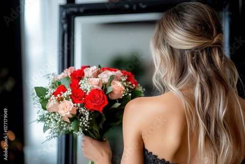 © Pinklife, Naklejka premium An elegantly dressed woman holding a beautiful bouquet of roses stands gracefully in front of a mirror, showcasing a moment of beauty and femininity in a stylish setting.