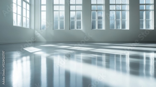 Obraz premium An elegantly minimalist empty room is illuminated by soft sunlight streaming through large windows, creating a serene and peaceful atmosphere perfect for reflection or creativity.