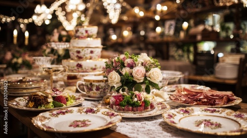 Naklejka premium An elegantly set dining table with floral fine china, red and gold accents, soft roses, greenery, cured ham,