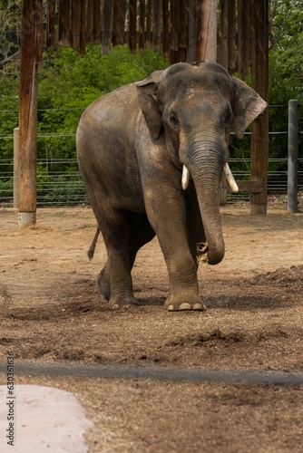 © Dominick Montano/Wirestock Creators, Fototapeta premium an elephant with tusks walking around a pen at the zoo