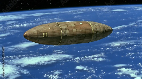 Fototapeta premium An elongated spacecraft floating above a beautiful blue planet