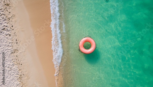 © two K, Naklejka premium An emerald beach with a swimming float on it. a summer recreation site, drone shot - Swim ring, swim tube, Tube Ring