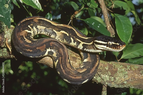 Naklejka premium An emerald boa constrictor coiled around a tree branch, its scales shimmering...
