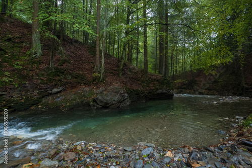 © Zdenka Kryspínová, Obraz premium An emerald river flowing through a beech forest