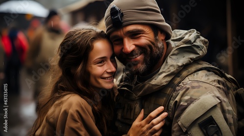 Fototapeta premium An emotional hug between soldiers returning from deployment