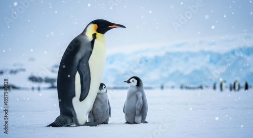 © SUGI, Fototapeta premium An Emperor penguin with two chicks stands in snow, with iceberg backdrop