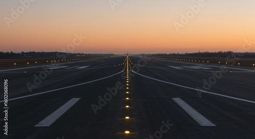 Fototapeta premium An empty airport runway stretches into the colorful twilight sky