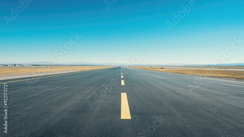 © 69, Fototapeta premium An empty airport runway under a clear blue sky, perfect for showcasing aviation and travel themes, wide-angle view