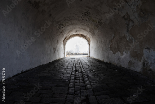Fototapeta premium An empty ancient dark tunnel with bright glowing end, abstract photo background