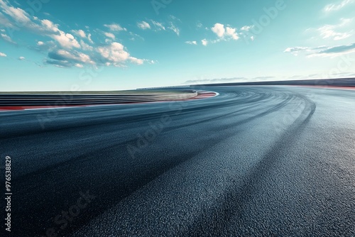 Fototapeta premium An empty asphalt race track curves towards the horizon under a blue sky with white clouds. The track is perfect for showcasing speed, power, and performance. It symbolizes freedom, adventure, and the