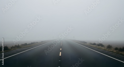 © Alfitra, Fototapeta premium An empty asphalt road disappearing into thick, dense fog.