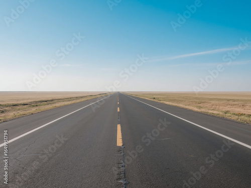 © zakwan, Naklejka premium An empty asphalt road stretching straight into the horizon with a clear blue sky above. Perfect for concepts of travel, freedom, future journey, motivation, adventure, long road trips, and exploring