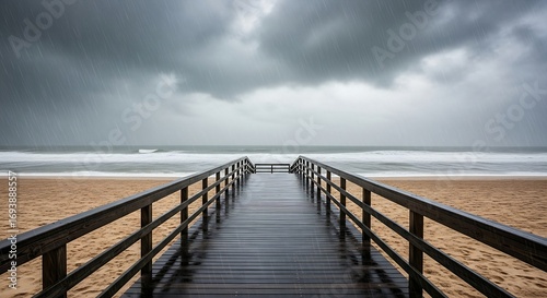 © Chanh2990, Fototapeta premium an empty beachfront boardwalk. The sky is dark and brooding, with heavy rain falling. The ocean is a churning, gray mass.