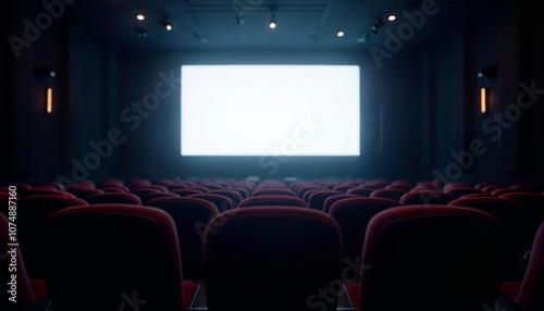 Fototapeta premium An empty cinema hall with rows of seats, a large white screen, and subtle...