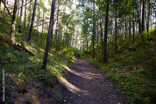Fototapeta premium An empty country road in a dense forest on a sunny summer day. Hiking. Unity...