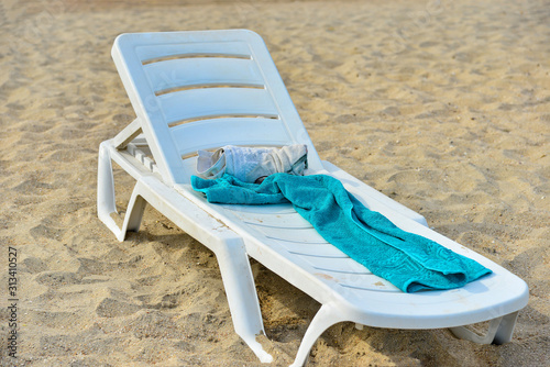 © andov, Obraz premium An empty deck chair with a towel stands on the beach by the sea.