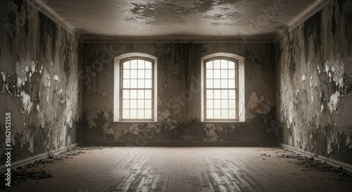 © RaNy, Obraz premium An empty, dimly lit room with peeling paint and exposed wooden floorboards.
