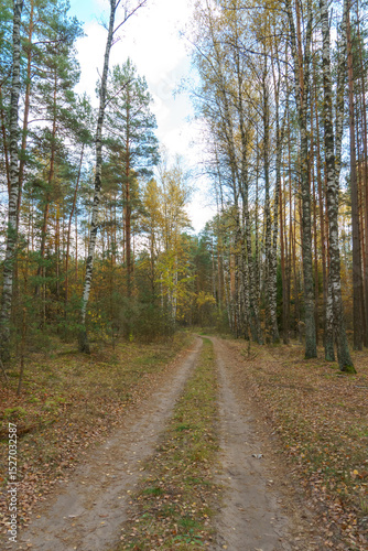 © Pokoman, Obraz premium An empty dirt road running through the forest. Autumn countryside at sunset.