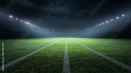 © Thiago, Obraz premium An empty football stadium field under the lights and a dramatic sky