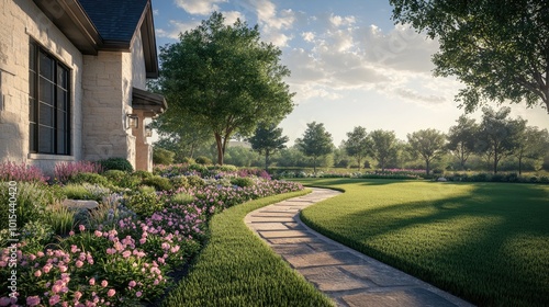 Fototapeta premium An empty front yard with a stone path, lush grass, and a blooming flower garden near the entrance of the house