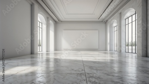 © Mudassir, Obraz premium An empty gallery space with a large blank white wall, marble floor, contemporary design, clear and minimalist concept. 3D Rendering