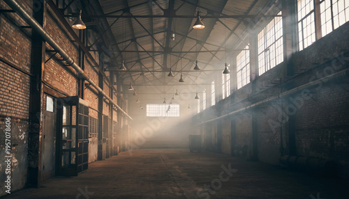 © jambulart, Fototapeta premium An empty industrial warehouse with large windows and sunlight streaming in.