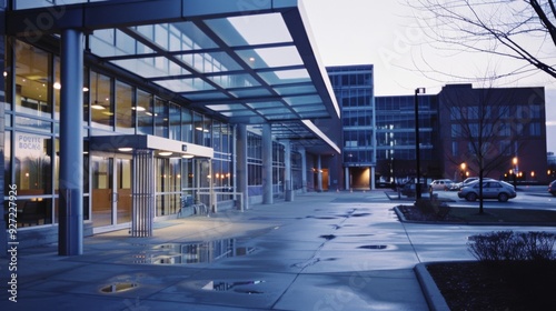 Naklejka premium An empty, modern office building exterior in the evening with reflections on wet pavement, illuminated by soft, ambient lighting, capturing a sense of quiet and calm.