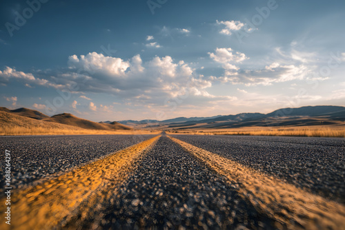 © AungThurein, Fototapeta premium An empty open road stretching into the horizon under a bright sky, representing freedom of travel