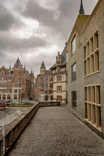 © Eli Bolyarska, Fototapeta premium An empty pavement alley at the old town of Antwerp