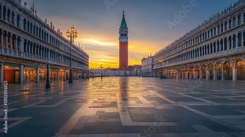 © sarun, Fototapeta premium An empty Piazza San Marco in Venice, with the bell tower and St. Mark Basilica in the background.
