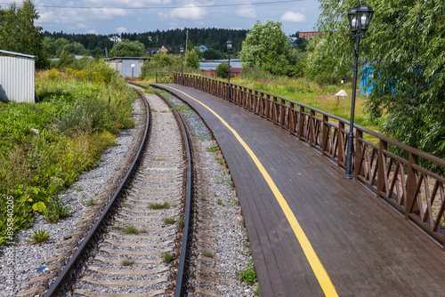 © evannovostro, Obraz premium An empty railway track turning left along a station platform