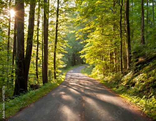© mixzacc, Fototapeta premium An empty road cutting through a thick forest. Tall trees line the path, and the sunlight filters through the leaves, casting patterns on the quiet road.