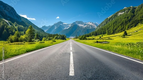 Naklejka premium An empty road through an alpine meadow, Road Banner, Mountain Meadow