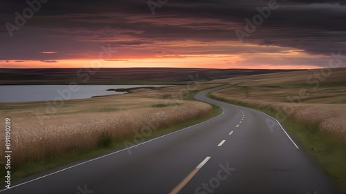 Fototapeta premium An empty road winding towards a serene lake at sunset. The horizon presents a...