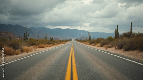 © Zeynep, Obraz premium An Empty Road With Cactus Plants on Both Sides of the Road - Generative AI