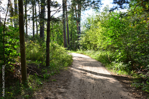 © Irina, Fototapeta premium an empty road with sunlight and trees on the side in the pine forest