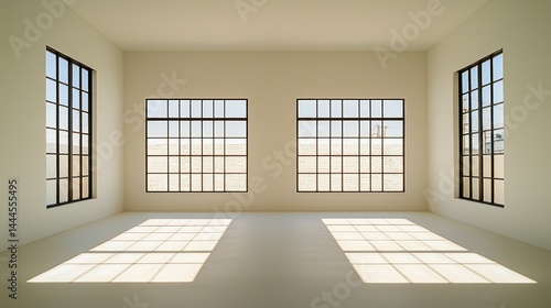 © pupus, Obraz premium An empty room featuring multiple grid windows with direct sunlight