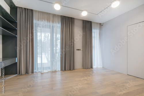 © Alhim, Obraz premium An empty room with a final finish. Unfurnished. Beautiful curtains on the panoramic window. Built-in shelving.