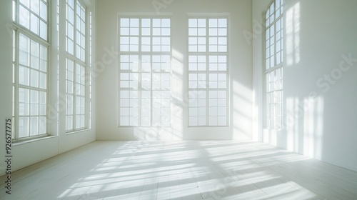 Fototapeta premium An empty room with clean white walls and large windows that flood the space with sunlight, casting gentle shadows.