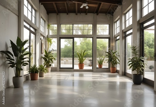 Obraz premium an empty room with plants and windows.