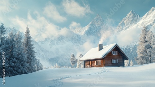 Naklejka premium An empty scene featuring (a snow-covered mountain cabin with smoke curling...
