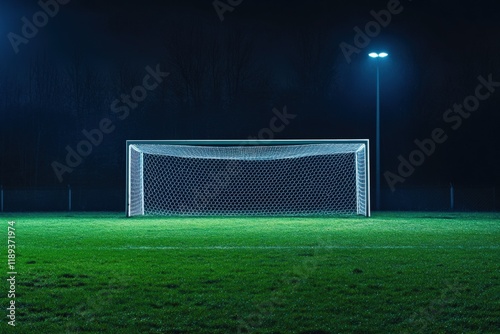 © Aashutosh Pandit, Fototapeta premium an empty soccer goal on a field at night