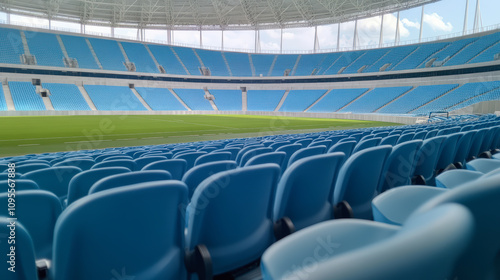 Fototapeta premium An empty sports stadium with rows of blue seats and a lush green field, awaiting the excitement of the upcoming game or event.