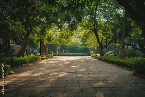 Fototapeta premium an empty square floor surrounded by lush greenery, capturing the serene natural scenery of a city park