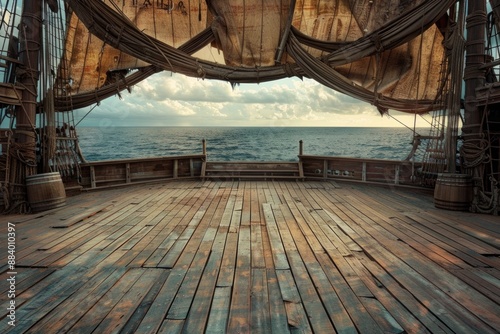 Fototapeta premium An empty stage on a pirate ship deck, with wooden planks, tattered sails...