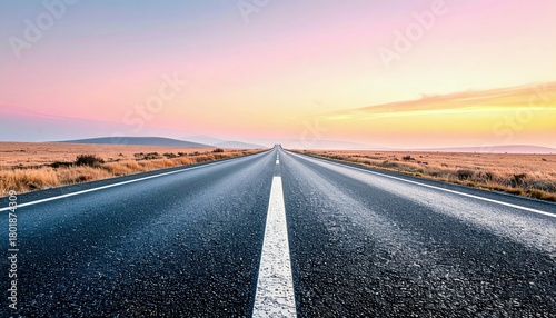 Fototapeta premium An empty, straight asphalt road disappears into the distance under a colorful sunset sky, bordered by dry, golden grass.