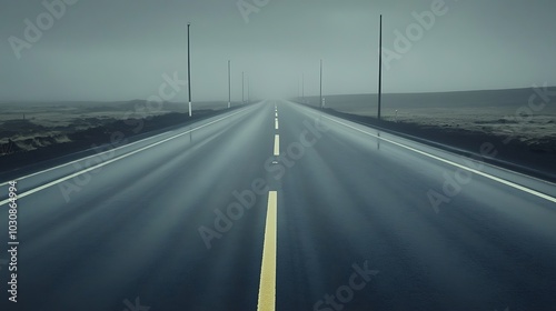 © loxia stock image, Fototapeta premium An empty, straight road disappears into the fog on a misty day.